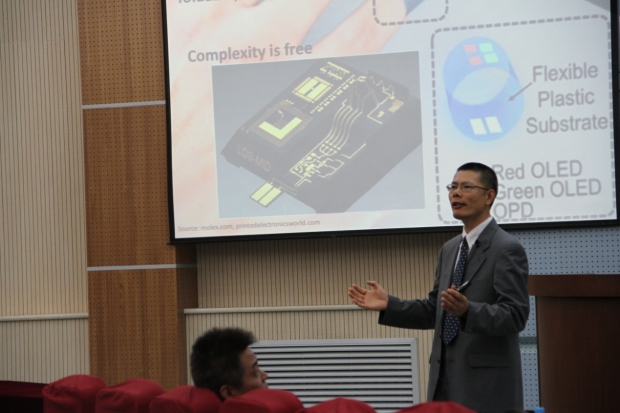 6月30日上午,潘建标教授在北校区阶梯教室112报告厅作了题为”印刷电子学:技术、应用和挑战”的精彩报告,报告会由黄进副院长主持,潘教授介绍了3D打印在电子学领域的应用,印刷电子学采用的印刷方法,印刷电子产品的应用领域和印刷电子学与传统的硅芯片进行灵活的混合使用面临的挑战,会后并与现场师生进行了交流。