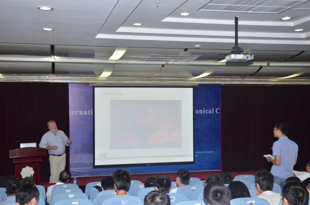 在深入了解实验室的研究工作后,Dennis教授于8月31日上午在新科技楼八楼与段宝岩院士进行长达1小时的交流后,来到北校区图书馆西裙楼报告厅,为我校师生带来了一场题为Structure Design and Current Progress of GBT(Green Bank Telescope)的精彩学术报告。实验室主任黄进教授对Dennis教授的到来表示了热烈欢迎,学术报告会由王从思教授主持。在报告中,他首先对GBT天线结构设计的基本特点、指标参数和近况进行了说明,然后就GBT反射体偏置与副面支撑结构的特殊性,详细论述了天线运行调试后在结构上做出的改进手段和保障技术、轨道的机械维护措施以及高效馈源接收机转动系统等内容。