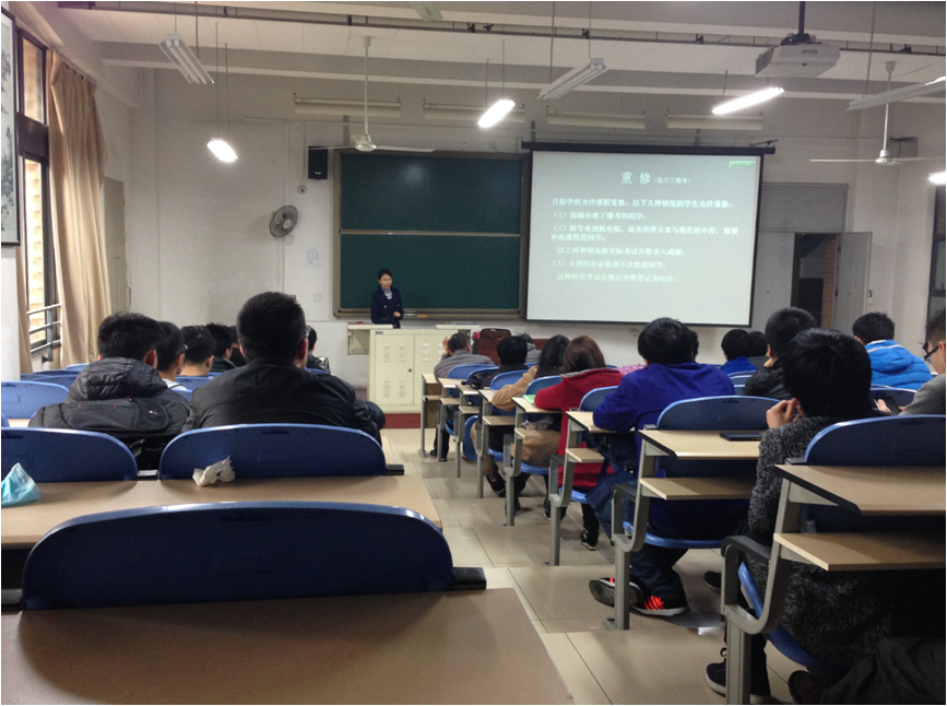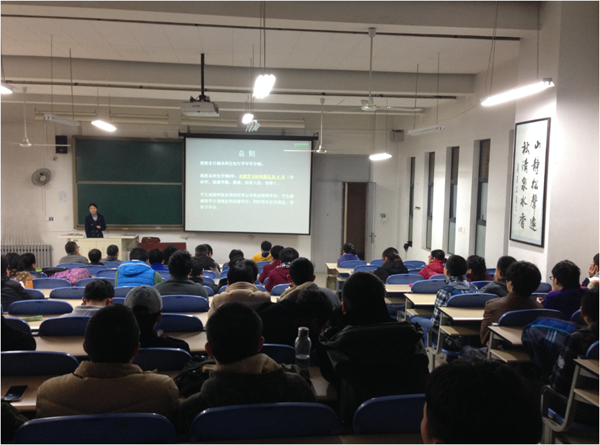 韩琪针对同学们在校期间比较关注的学籍管理相关规定和普遍存在的一些问题进行了系统的介绍和答疑。主要讲解了选课、补考、学籍处理的规定和流程;详细介绍了学院的课程设置、各专业毕业学分要求、毕业证学位证的获得条件;针对现用的教务系统,给同学们强调了在选课和补考预约时的注意事项;对学生现场提出的问题进行了解答。