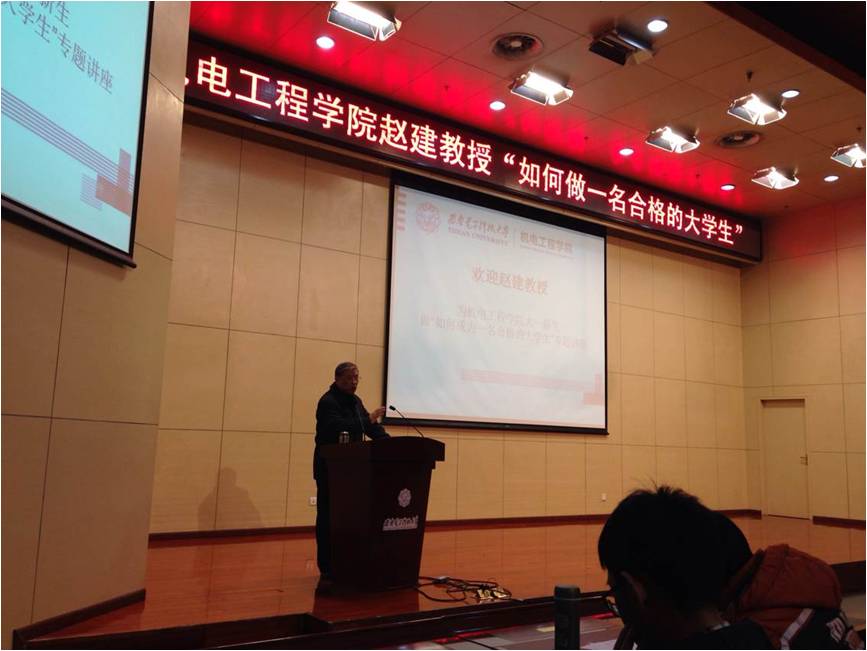 讲座中,赵建由表及里,先简介了自己讲话的内容,接着从三个方面来具体论述如何做一名合格的大学生。第一,要求大家学好课本内的知识,课本是学习其他内容的基础;第二,要求大家对知识扩展和深入地学习知识,从各方面获取对自己有用的知识;第三,要求同学们积极进行动手实践,丰富自己的经验。他鼓励同学们认真学习专业知识,结合学校发展的优势并努力发展自己的特长,将所学的知识应用到实际中去,积极参加各项科技实践活动,提升自己的实践动手和工程解决能力,为社会发展做出贡献。