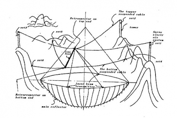 这一方案的核心就是将原阿雷西博方案中,用于支撑线馈源的重达1000吨的钢结构,用计算机伺服系统控制的从6个塔顶伸出的6根大跨度的柔索来取代。同时,布置3台激光测距仪实时获取馈源的实际位姿,通过6索长度的自动调整,将馈源调回到电性能所允许的误差范围之内。