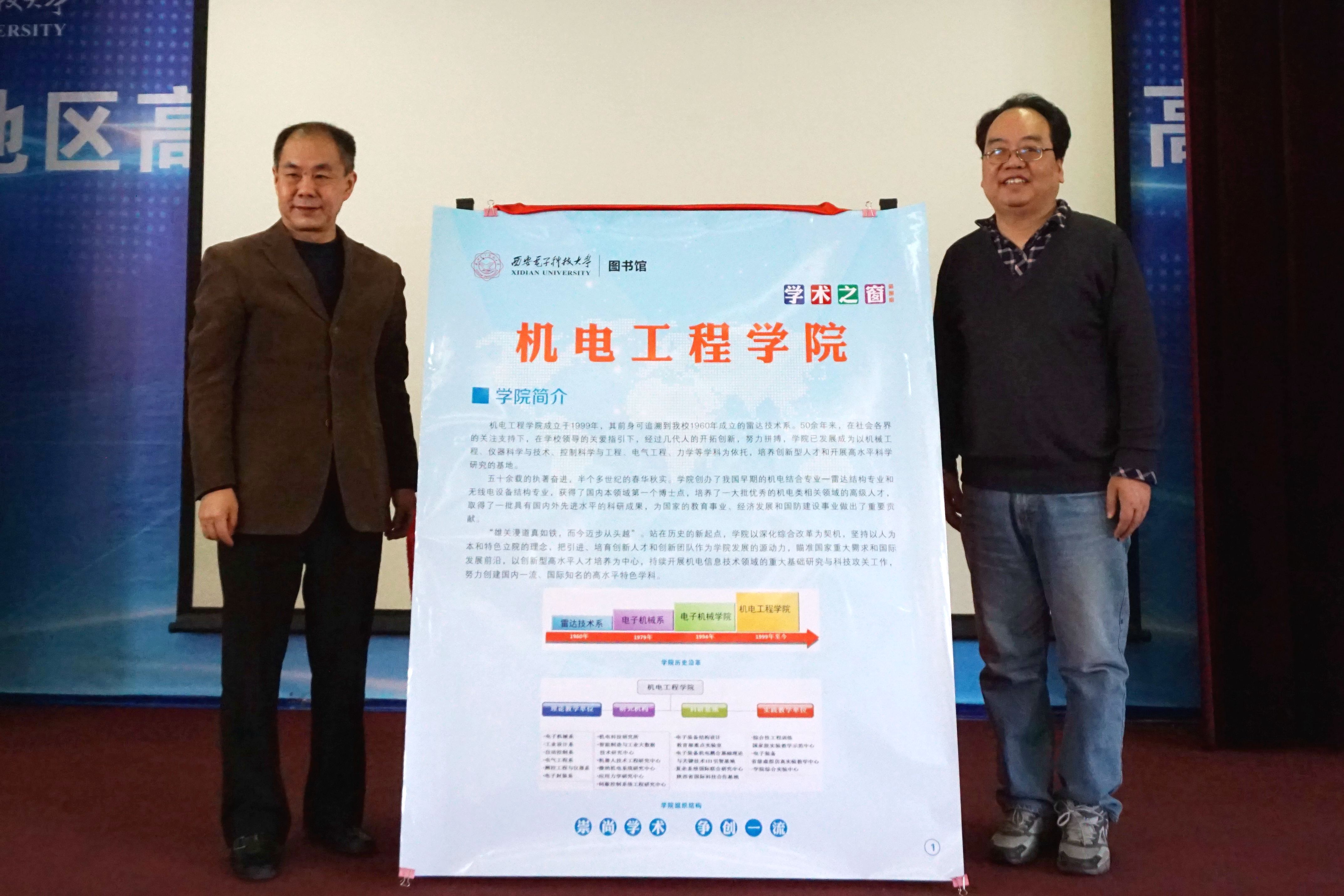 图书馆馆长卢朝阳在讲话中首先对图书馆学术之窗工作做了简要回顾和总结。他说,开展学术之窗工作,是图书馆为了进一步丰富和拓展西电图书馆的学术研究功能,更好地发挥图书馆信息资源中心的作用而采取的一项重要举措,我们希望通过图书馆这个公共平台,持续的全方位展示各学院的教学科研成果,宣传各学院的特色,帮助不同学院、不同专业的老师和同学全面了解各个学院的发展状况,帮助同学有更广的学业规划选择,同时也为学校创建“一流大学、一流学科、一流专业”做出应有的贡献。他说,自2016年3月启动以来,学术之窗已经发布了七期。这七期“学术之窗”以详实严谨的数据、丰富多彩的图片和精准概括的文字叙述,先后展示了西电科学研究的总体绩效水平、优势学科与潜力学科的发展情况,展示了学校学位与研究生教育取得的标志性成果,展示了生命科学与技术学院、空间科学与技术学院、数学与统计学院、经济与管理学院、人文学院的成果和风采,得到了广大同学的和老师的好评。