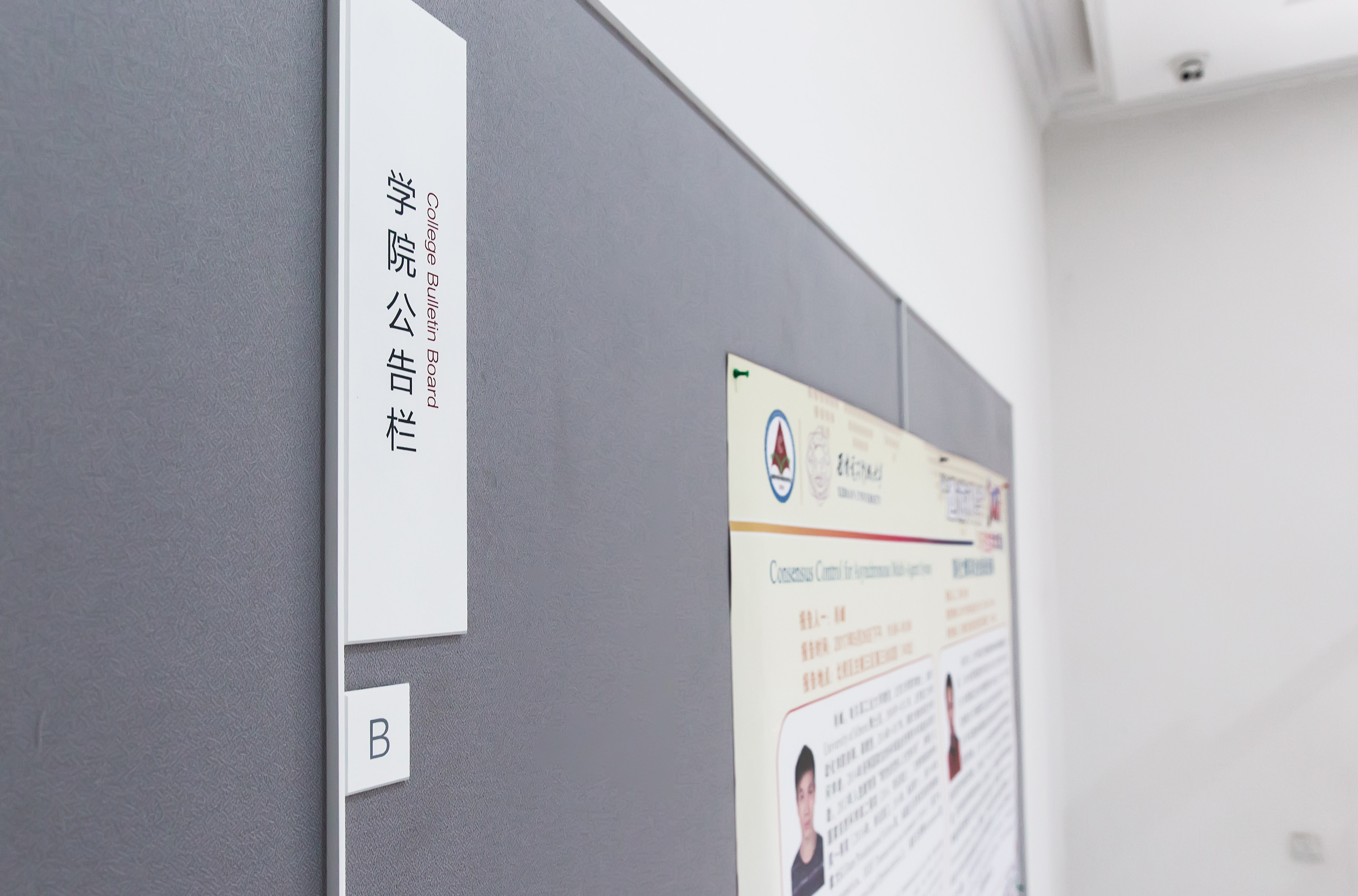 中英文双语指示与学院目前国际化进程相契合,为国际友人提供一份善意、点滴的温暖。在视觉传达的过程中,蕴含出学院优良的院风、教风、学风。