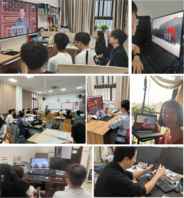 本科实验教学中心党支部的教师们组织实验室学生一起集中观看了此次大会,内心的震撼与自豪难以言表。支部书记章云说,历史告诉我们,关键技术是买不来的,安全和尊严是乞讨不到的。本次阅兵式武器装备全产业链的自主研制,体现了中国国防科技工业的整体飞跃,凝聚着无数科技工作者的智慧与心血,是几代人十年如一日科研攻坚的创新成果。本次阅兵,是一堂缅怀历史、展望未来的国防教育思政课,我们身为党员教师和科研工作者,要不断提升科技认知、创新与运用能力,把论文写在祖国的大地上,以严谨认真的科学态度,脚踏实地的工作作风,努力在各自领域做出实实在在的创新贡献。