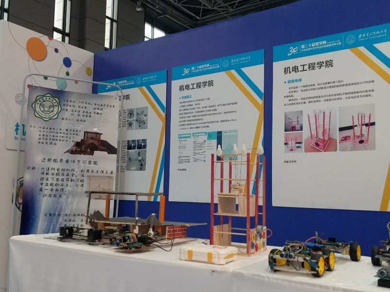 早在主馆的开幕式正式开始之前,副馆作品展区就已经热闹非凡。在我院团委老师及科协的精心筹备下,我院展区的优秀作品琳琅满目。一路杀进冠军争夺赛的柔性抓取机械爪、创新设计的激光雕刻机,各种炫酷机器人等高水平作品展现了机电院学子卓越的科技创新水平与科技实践能力,由低年级同学制作的遥控小车、光立方也充分体现了他们对科技制作高昂的热情,趁着“星火杯”的东风,我院再次掀起一阵科技创作的热潮。讲解人员也是早早到位,为前来参观的嘉宾献上最专业最细致的讲解,展现机电院学生的独特风采。