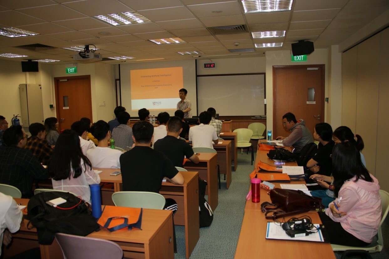 开营仪式由Zhang Rongli博士主持。张博士从活动安排、新加坡国情概况、教育体制和NUS介绍等方面向同学们做了讲解,拉开了智能机器人技术训练营的序幕,让同学对丰富的讲座和体验活动充满了期待。随后,yl23455永利集团王飞老师向NUS张老师和李海洲教授赠送西电定制礼物,双方合影留念。随后,李海洲教授以人工智能的相关背景与发展以及语音处理的相关技术为题目,为同学们做了一场精彩的报告。