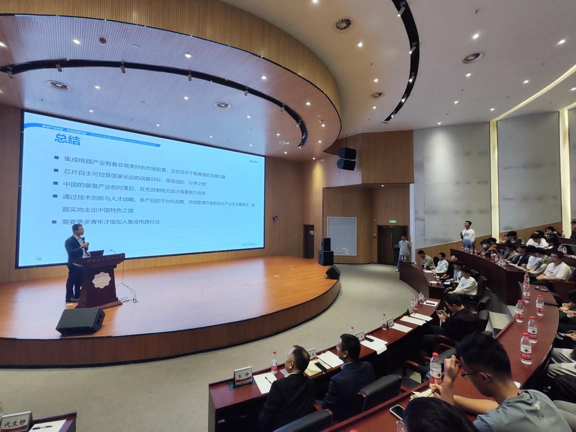(通讯员 张铭 陈聪)为深入学习贯彻党的二十大精神,引导青年学子树立崇高的理想,增加yl23455永利集团学生对半导体装备产业发展趋势和市场机遇的认知和理解,北方华创与yl23455永利集团在前期科研项目、人才培养和产业链等方面合作的基础上,为学院“集成电路装备自强班”专门开设“制造强国”系列课程。10月9日下午,北方华创微电子装备有限公司总裁董博宇受邀在南校区会议中心B101报告厅讲授第一门系列课程第一讲——《集成电路装备产业概述》,“集成电路装备自强班”的200余名学生认真聆听了课程,北方华创总裁助理夏振军,人力资源中心高校关系总监王铮,学院相关系所教师代表、本科生辅导员代表在现场共同旁听了本次课程。