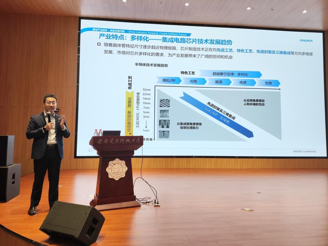董博宇分别从集成电路技术及产业发展趋势概述、集成电路工艺流程及工业设备介绍、产业发展新形势下北方华创的现状进行了阐述。他指出半导体产业是数字经济的基石,已成为国家构建战略科技力量自立自强的核心支撑产业。芯片制造技术是集材料、设备、工艺的物理极限组合,同时还兼具迭代快、多样化、装备复杂、验证周期长等特点,其正在向先进工艺、特色工艺、先进封装及三维集成三个维度发展,同时人工智能、大数据等应用市场爆发也为产业发展带来了广阔的空间和机会。他鼓励同学们要构建坚实的基础知识,在科研和创新的道路上,不仅要追求卓越,更要勇于面对探索过程中产生的困难和挑战,更加坚定地追求科研的深度和广度,勇攀科技高峰,踊跃投身我国半导体装备行业建设,为中国集成电路装备产业的自立自强贡献自己的一份力量。