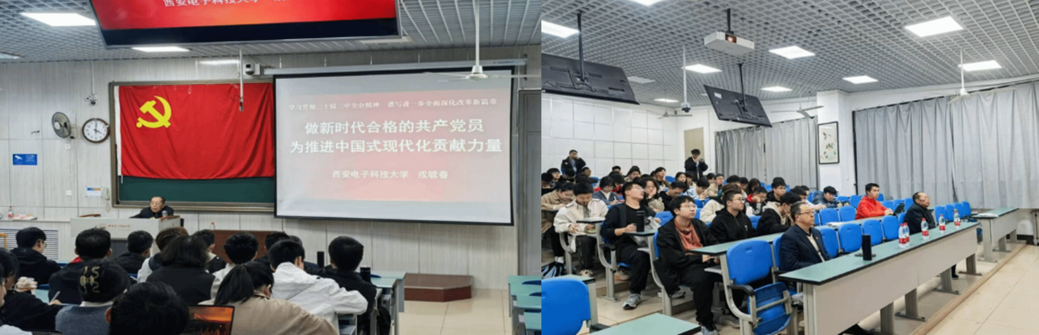 戎毓春教授结合《中共中央关于进一步全面深化改革、推进中国式现代化的决定》这一文件,阐述了新时代新征程党的历史使命。与其同时,他巧妙运用哲学概念“共性与个性”,向同学们生动阐释了何为“中国式现代化”,并强调了中国式现代化对世界现代化道路的重大意义以及全面深化改革的重要举措,解释国家科教兴国、人才强国、创新驱动发展战略与西电的联系。他提到:“党办的大学让党放心,人民的西电不负人民。”让同学们切身体会到国家战略对自身的影响,明确为国成才的目标。