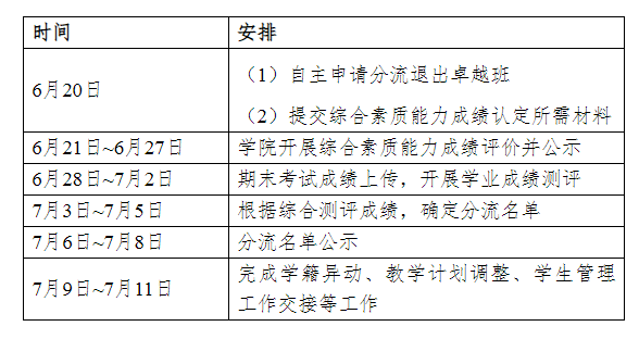 1.确因身体原因、存在学业困难等特殊情况需要申请分流退出卓越班的学生,可及时向学院提出书面申请,一事一议,不受集中分流时间限制。