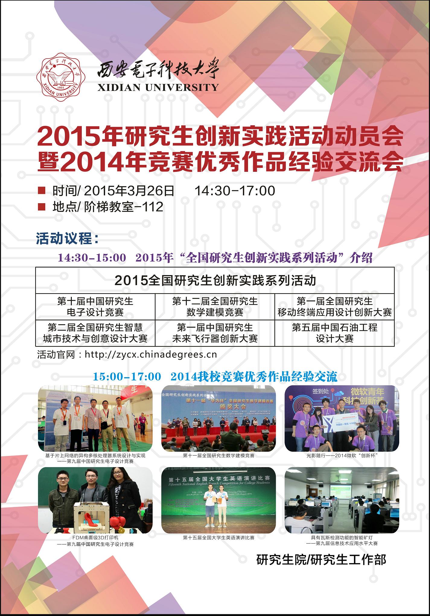 阶梯教室112召开“yl23455永利集团2015年研究生创新实践活动动员会暨2014年竞赛优秀作品经验交流会”。届时,将向大家介绍2015年研究生创新实践活动六大赛事的具体情况,并由 2014年度竞赛获奖优秀队伍介绍参赛经验。