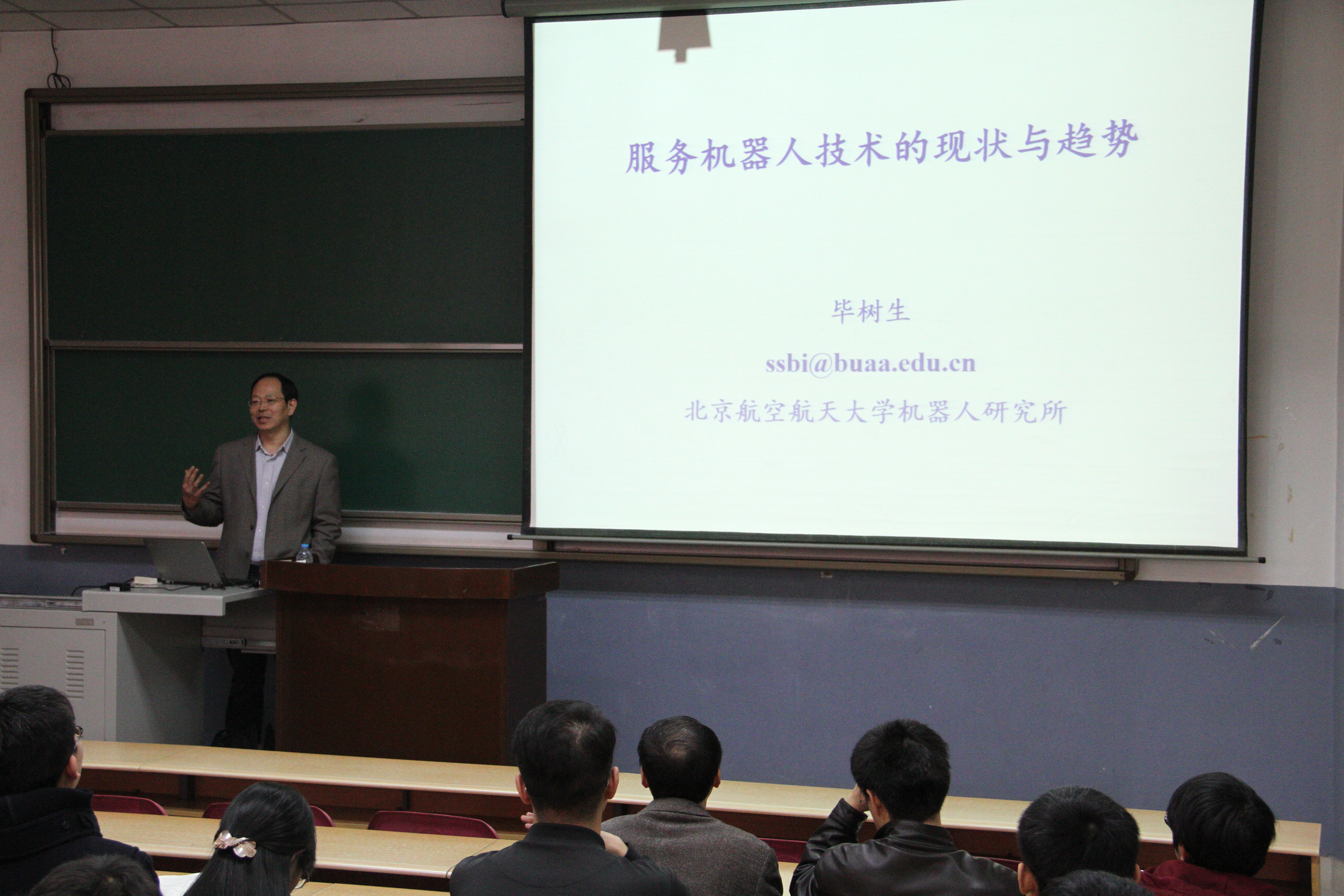 (通讯员 葛持恒)3月5日,应yl23455永利集团智能制造与机器人技术工程研究中心陈贵敏教授邀请,北京航空航天大学机器人研究所毕树生教授来我校访问交流。5日下午,毕树生教授在阶梯教室J-204做了题为《服务机器人技术的现状与趋势》的学术报告,报告会由yl23455永利集团副院长黄进教授主持,学院教师及研究生150余人到场聆听报告。