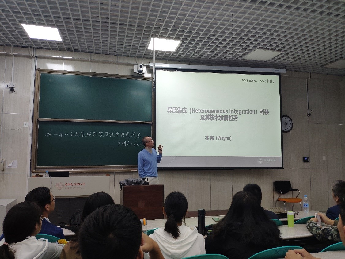 随后,林伟博士对异质集成封装的优势、核心问题及其挑战进行了重点讲解,并指出了半导体封装发展的方向和趋势。详细介绍了当前异质集成封装在实际工程中广泛的应用,如The Apple Watch的SiP模块、ASIC和Memory Integration。通过对示例的讲解,同学们对异质集成的理解更加清晰和深刻。林伟博士从工程实际出发,对异质集成封装的layout布局、各类制程和可靠性评估等核心问题以及面对的挑战一一进行讲解,并举出封装互连形式由引线转变为焊球的简单示例,从而鼓励同学们在学习中多多思考“为什么”。与会老师与林伟博士在对先进封装的发展方向上进行了深入的交流并达成一致。