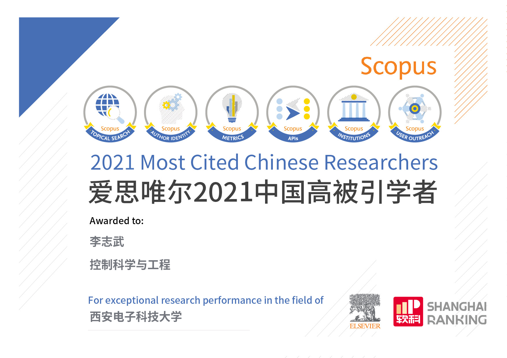 近日,全球性信息分析公司爱思唯尔(Elsevier)正式发布了2021“中国高被引学者”(Highly Cited Chinese Researchers)榜单,yl23455永利集团李志武教授入选“控制科学与工程”、苏玉鑫教授入选“机械工程”榜单,李志武教授已连续八年入选,苏玉鑫教授连续2年入选。