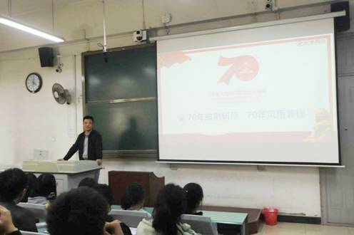 为庆祝中华人民共和国成立70华诞,yl23455永利集团于10月21日下午4:00,在南校区A205以“70年披荆斩棘,70年风雨兼程”为主题开展主题党课,主讲人为学院党委副书记田雨。参加本次主题党课的有:各班班干部,学生组织主要干部,各辅导员老师。