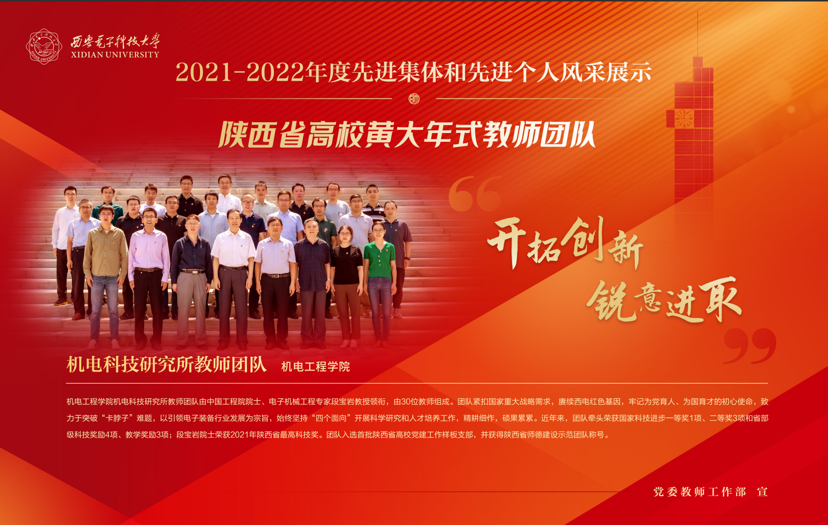 yl23455永利集团机电科技研究所团队由中国工程院院士、电子机械工程专家段宝岩教授领衔,由30位教师组成。团队紧扣国家重大战略需求,赓续西电红色基因,牢记为党育人、为国育才的初心使命,致力于突破“卡脖子”难题,以引领电子装备行业发展为宗旨,始终坚持“四个面向”开展科学研究和人才培养工作,精耕细作,硕果累累。
